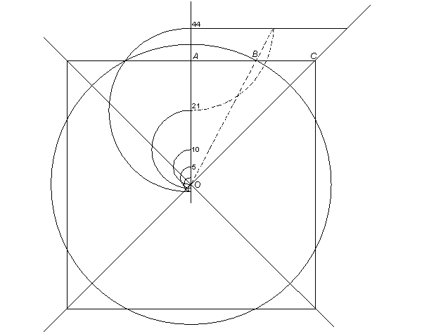 The viewer should not have too much trouble calculating that the length of the first radius is contained 100 times in the measure starting and ending at A. Counting from A, the first endpoint reached after B can be seen to be 14 times that radius, the next endpoint 27 times, C 54 times, and since B is from C less by 8, namely 46, so is on the opposite side A; and 46+54=100. Where and to what extent arcs can in this manner be increased (which they needn't be) for a polygon, or for a divided angle, may not be always easy to detect, although there are normally several relations possible for such arcs. My objective was rather, again, to demonstrate that not only can these methods be economical, but that the process of "sliding" or "insertion" can often be performed with simplified structures and compass alone, let alone with an unmarked ruler besides. It may be added that the above method of constructing any regular polygon or dividing an angle into any number of equal parts is more significant in geometry than it may seem. Geometers may be at a complete loss if asked to construct for example a regular polygon of some arbitrary number of sides. An aid like a protractor may be of assistance, if deficiently so, especially the larger the polygon. The same is the case when approximations for certain polygons exist. In contrast, the above method allows for more precision the larger the polygon, because the relative difference in accuracy can continually be reduced by any practicable amount. 26 December 2002 The next drawing utilizes once more the increasing arcs, this time without a need for "insertion", but the drawing is only an expected approximation in regard to "squaring the circle", one of the threesome of ancient problems mentioned. Its aim has been to construct a square of the same area as a circle, a task hindered by the irrational nature of connected pi, the measure of a circle's circumference in relation to the diameter. In those constructions, pi, which is 3.14159... to infinity, has been approximated to half a dozen and more correct decimal places, and it is not the intention here to trump these, but rather to present a good approximation of exceptionally simple construction, by again only an unmarked ruler and compass. The approximation is to almost five decimal places, 3.14158..., which will be seen to go very far. |